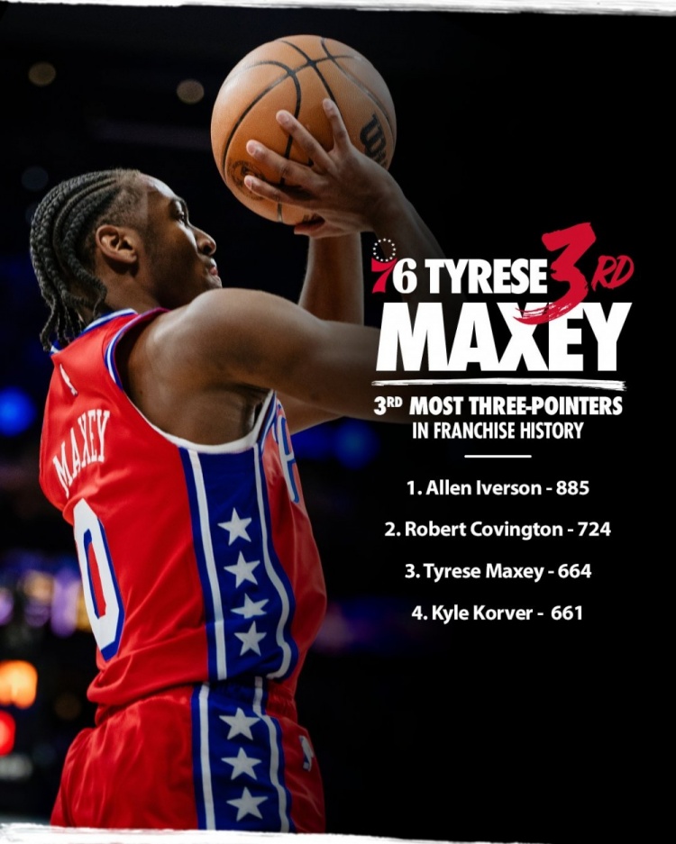 据统计体育集锦,马克西76东说念主活命三分掷中数还是达到664记,超过科沃尔(661)名次队史第三,仅次于艾弗森和考文顿。
