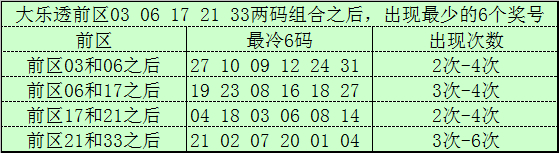 前区冷码统计:大乐透第26008期前区奖号为:03、06、17、21、33,放手第26008期历史上大乐透也曾开出了2826期奖号了,在磋议两码奖号中: