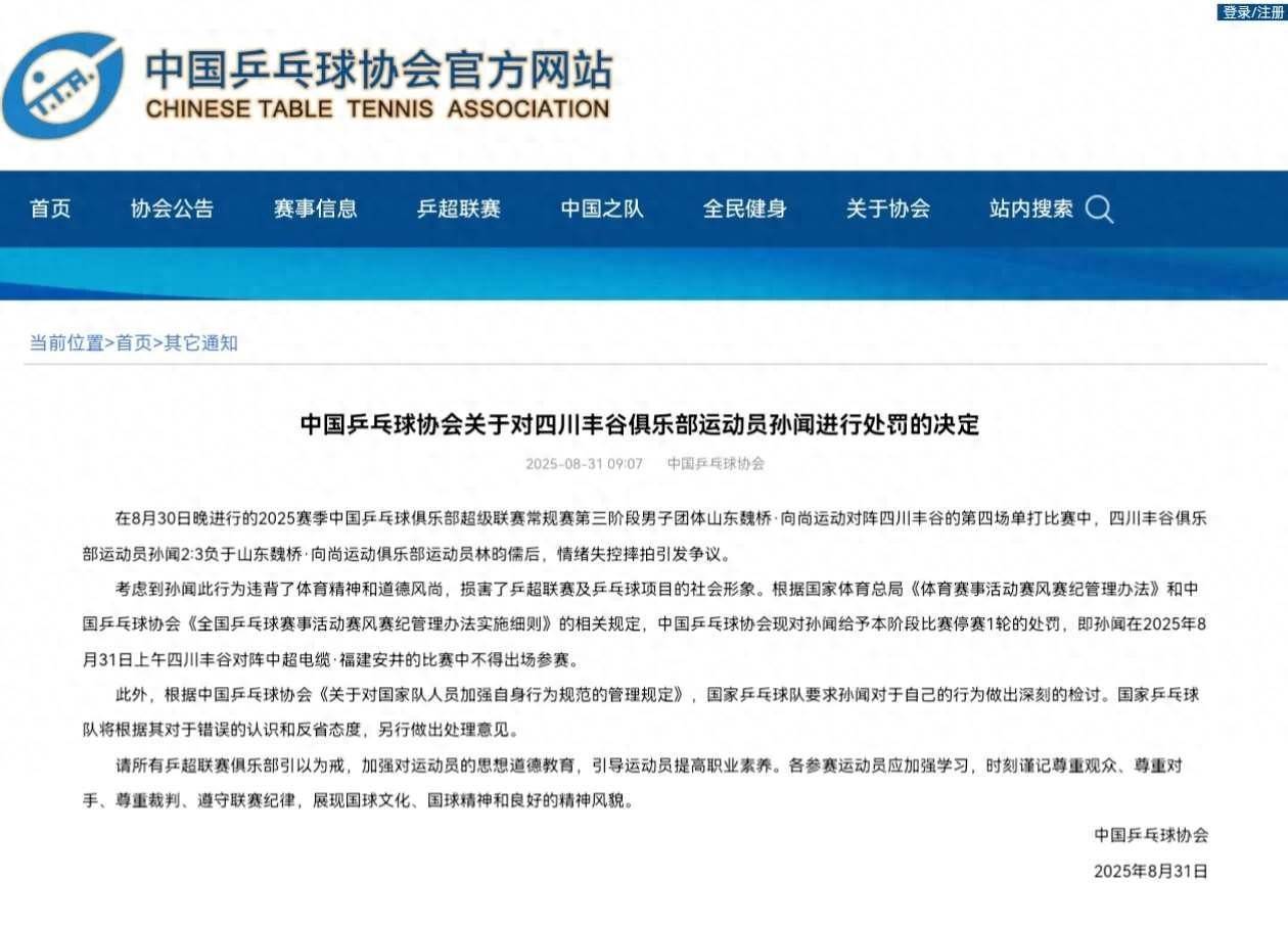 本次在新疆举行的2025年中国乒超联赛旧例赛第三阶段男团比赛,孙闻代表四川丰谷队出战。与山东魏桥队一战,孙闻在单打比赛中与王楚钦、林昀儒交手。两场比赛,孙闻均因发球回抛而被裁判罚分,最终输掉比赛。尤其是在与林昀儒的比赛中,孙闻在决胜局逾越情况下遇到争议判罚,被敌手收拢契机完成逆转。输球后,孙闻心境失控怒摔拍子,且存在悲怆持手举止,外界多数以为其举止违背体育精神,应受到禁赛处罚。