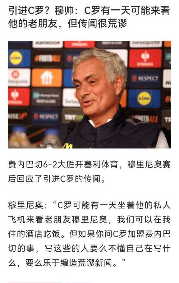 何塞·穆里尼奥是这样说的:“也许有一天,克里斯蒂亚诺·罗纳尔多会乘坐他的私东说念主飞机,来走访他的老一又友何塞·穆里尼奥。咱们不错在四季栈房共进晚餐(没说我方宴客)。但要是你问C罗是否转会费内巴切,我合计写这类新闻的东说念主,要么不知说念我方在写什么,要么即是乐于制造舛讹的音讯。”